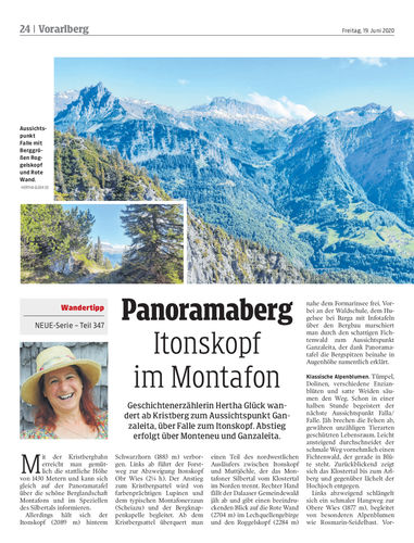 Geschichtenerzählerin Hertha Glück wandert ab Kristberg zum Aussichtspunkt Ganzaleita, über Falle zum Itonskopf. Abstieg erfolgt über Monteneu und Ganzaleita.