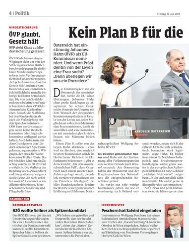 Österreich hat einstimmig Johannes Hahn (ÖVP) als EU-Kommissar nominiert. Und wenn Präsidentin von der Leyen eine Frau sucht? „Dann überlegen wir uns ein Prozedere.“