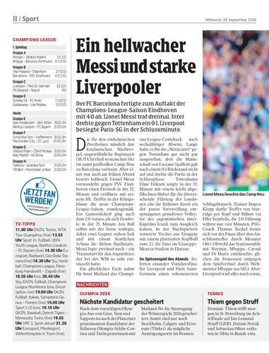 Der FC Barcelona fertigte zum Auftakt der Champions-League-Saison Eindhoven mit 4:0 ab. Lionel Messi traf dreimal. Inter drehte gegen Tottenham ein 0:1, Liverpool besiegte Paris-SG in der Schlussminute.