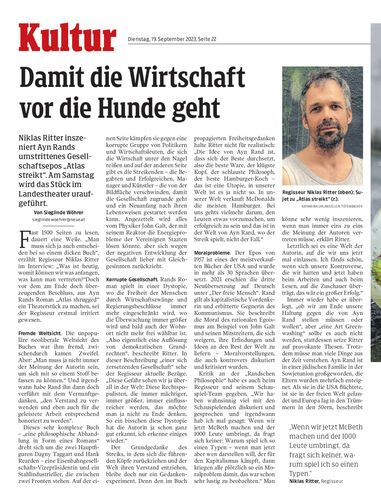 Niklas Ritter inszeniert Ayn Rands umstrittenes Gesellschaftsepos „Atlas streikt“. Am Samstag wird das Stück im Landestheater uraufgeführt.