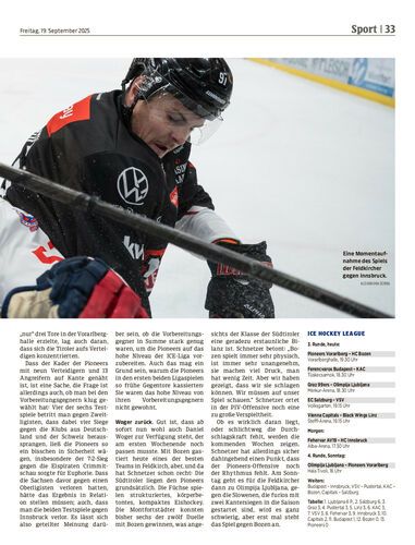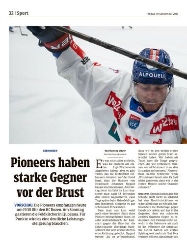 Vorschau. Die Pioneers empfangen heute um 19.30 Uhr den HC Bozen. Am Sonntag gastieren die Feldkircher in Ljubljana. Für Punkte wird es eine deutliche Leistungssteigerung brauchen.
