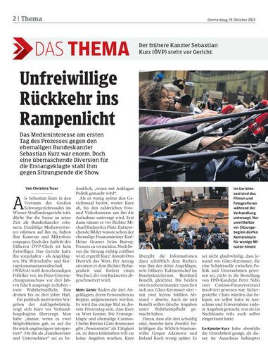 Das Medieninteresse am ersten Tag des Prozesses gegen den ehemaligen Bundeskanzler Sebastian Kurz war enorm. Doch eine überraschende Diversion für die Erstangeklagte stahl ihm gegen Sitzungsende die Show.