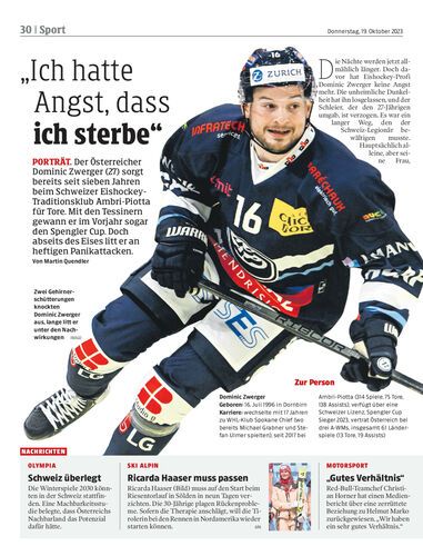 Porträt. Der Österreicher Dominic Zwerger (27) sorgt bereits seit sieben Jahren beim Schweizer Eishockey- Traditionsklub Ambri-Piotta für Tore. Mit den Tessinern gewann er im Vorjahr sogar den Spengler Cup. Doch abseits des Eises litt er an heftigen Panikattacken. Von Martin Quendler