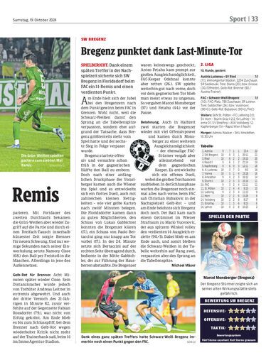 Spielbericht. Dank einem späten Treffer in der Nachspielzeit sicherte sich SW Bregenz in Floridsdorf beim FAC ein 1:1-Remis und einen verdienten Punkt.