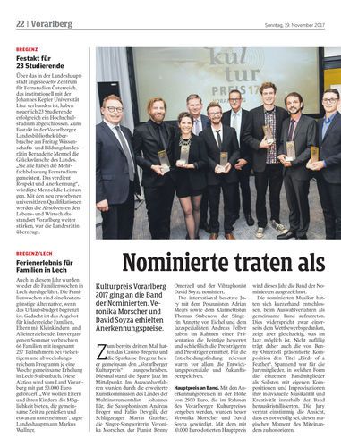 Kulturpreis Vorarlberg 2017 ging an die Band der Nominierten. Veronika Morscher und David Soyza erhielten Anerkennungspreise.