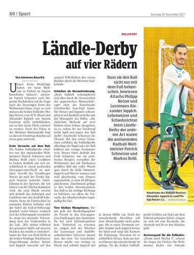 Dass sie den Ball nicht nur mit dem Fuß beherrschen, bewiesen Altachs Philipp Netzer und Lustenaus Alexander Joppich. Lehrmeister und Schiedsrichter beim Ländle-Derby der anderen Art waren die amtierenden Radball-Weltmeister Patrick Schnetzer und Markus Bröll.