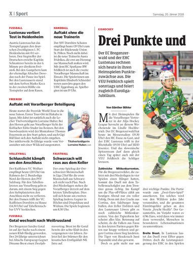 Der EC Bregenzerwald und der EHC Lustenau rechnen sich heute in ihren Heimspielen Punktezuwächse aus. Die VEU Feldkirch spielt sonntags und feiert zugleich Euroliga-Jubiläum.