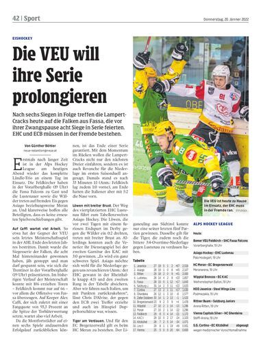 Nach sechs Siegen in Folge treffen die Lampert-Cracks heute auf die Falken aus Fassa, die vor ihrer Zwangspause acht Siege in Serie feierten. EHC und ECB müssen in der Fremde bestehen.