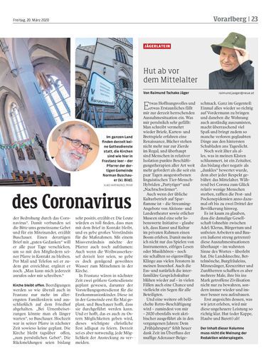 Die Pfarrer dürfen derzeit keine Gottesdienste und auch keine anderen größeren kirchlichen Feiern abhalten. Der Pfarrer von Frastanz, Norman Buschauer, erzählt, wie er in dieser Zeit Kontakt zu seinen Pfarrmitgliedern hält.
