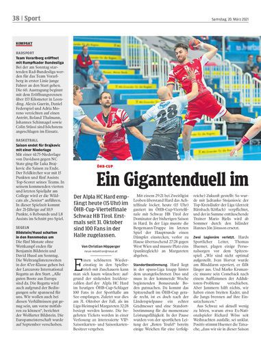Der Alpla HC Hard empfängt heute (15 Uhr) im ÖHB-Cup-Viertelfinale Schwaz HB Tirol. Erstmals seit 31. Oktober sind 100 Fans in der Halle zugelassen.