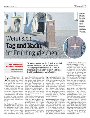 Für Meteorologen hat der Frühling vor drei Wochen begonnen. Der astronomische Frühling beginnt heute um 16.33 Uhr. Zu diesem Zeitpunkt überschreitet die Sonne den Himmelsäquator nach Norden.