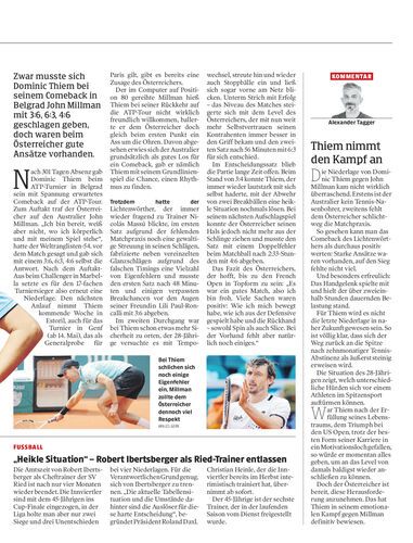 Zwar musste sich Dominic Thiem bei seinem Comeback in Belgrad John Millman mit 3:6, 6:3, 4:6 geschlagen geben, doch waren beim Österreicher gute Ansätze vorhanden.