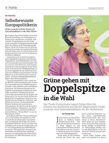 Die Tiroler Parteichefin Ingrid Felipe führt die Grünen von Innsbruck aus, die EU-Abgeordnete Ulrike Lunacek wird Spitzenkandidatin für die Herbstwahl.