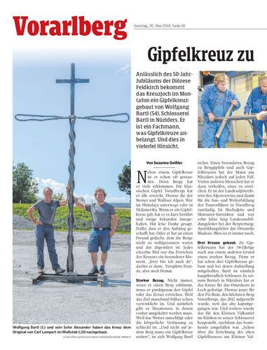 Anlässlich des 50-Jahr-Jubiläums der Diözese Feldkirch bekommt das Kreuzjoch im Montafon ein Gipfelkreuz: gebaut von Wolfgang Bartl (54), Schlosserei Bartl in Nüziders. Er ist ein Fachmann, was Gipfelkreuze anbelangt. Und dies in vielerlei Hinsicht.