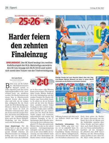 Spielbericht. Der HC Hard besiegt im zweiten Halbfinalspiel der HLA-Meisterliga auswärts den HC Linz knapp mit 26:25 (14:13) und wahrt sich somit den Traum von der Titelverteidigung.