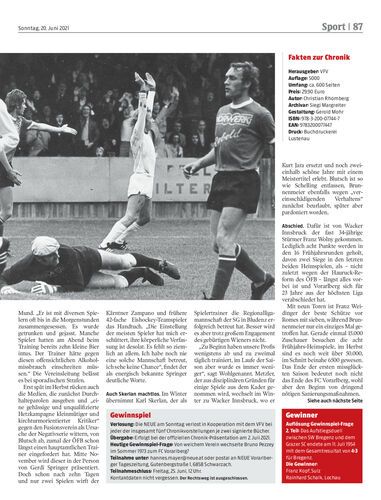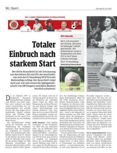 Der dritte Ausschnitt ist ein Textauszug von den Seiten 252 und 253, der beschreibt, wie sich der FC Vorarlberg 1973/74 in der Nationalliga schlug. Der Ausschnitt zeigt auch auf, wie und woran die Spielgemeinschaft von SW Bregenz und Rätia Bludenz letztlich scheiterte.