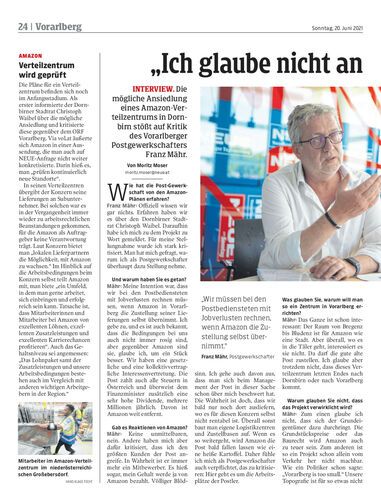 Interview. Die mögliche Ansiedlung eines Amazon-Verteilzentrums in Dornbirn stößt auf Kritik des Vorarlberger Postgewerkschafters Franz Mähr.
