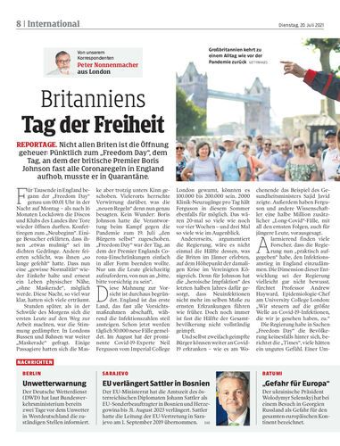 reportage. Nicht allen Briten ist die Öffnung geheuer: Pünktlich zum „Freedom Day“, dem Tag, an dem der britische Premier Boris Johnson fast alle Coronaregeln in England aufhob, musste er in Quarantäne.