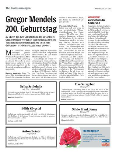 Zu Ehren des 200. Geburtstags des Botanikers Gregor Mendel werden in Tschechien zahlreiche Veranstaltungen durchgeführt. In seinem Geburtsort wird ein Gottesdienst gefeiert.