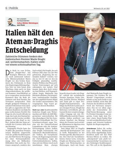 Zahlreiche Stimmen fordern den italienischen Premier Mario Draghi auf, weiterzumachen. Italien steht vor einem schicksalhaften Tag.