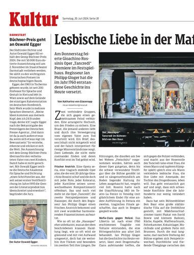 Am Donnerstag feierte Gioachino Rossinis Oper „Tancredi“ Premiere im Festspielhaus. Regisseur Jan Philipp Gloger hat die im Jahr 1760 entstandene Geschichte ins Heute versetzt.
