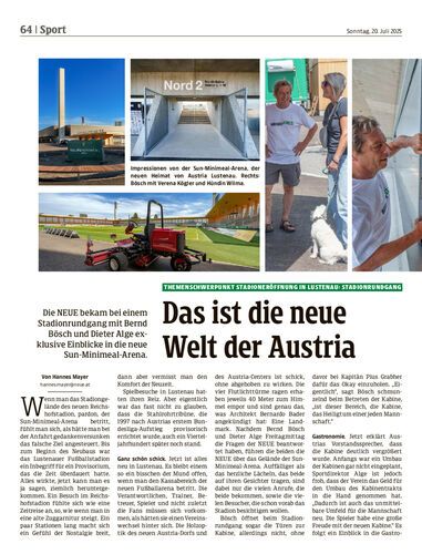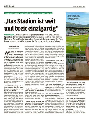 Interview. Austrias Vorstandssprecher Bernd Bösch und Austria-Sportdirektor Dieter Alge sprechen im Interview darüber, was die Sun-Minimeal-Arena für alle Austrainer ändert, die Unterstützung der Fans in den vergangenen Wochen und die Euphorie vor der neuen Saison.