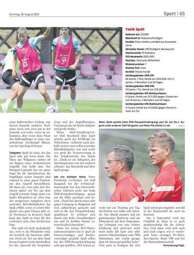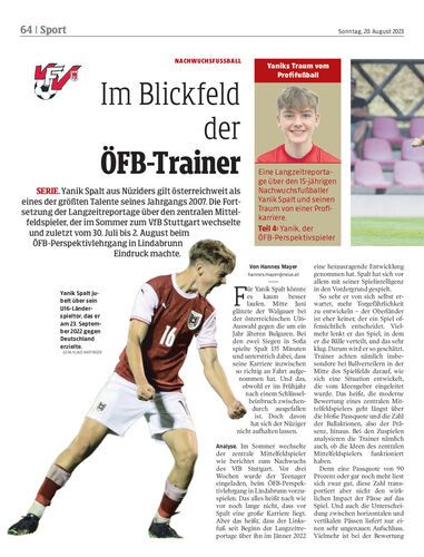 Serie. Yanik Spalt aus Nüziders gilt österreichweit als eines der größten Talente seines Jahrgangs 2007. Die Fortsetzung der Langzeitreportage über den zentralen Mittelfeldspieler, der im Sommer zum VfB Stuttgart wechselte und zuletzt vom 30. Juli bis 2. August beim ÖFB-Perspektivlehrgang in Lindabrunn Eindruck machte.