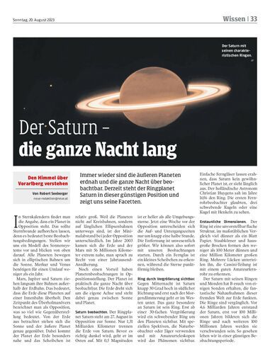 Immer wieder sind die äußeren Planeten erdnah und die ganze Nacht über beobachtbar. Derzeit steht der Ringplanet Saturn in dieser günstigen Position und zeigt uns seine Facetten.