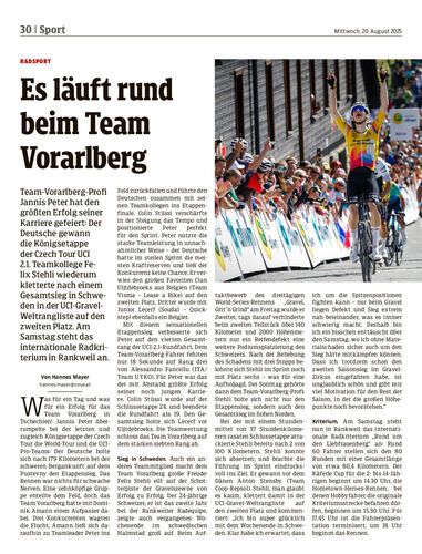 Team-Vorarlberg-Profi Jannis Peter hat den größten Erfolg seiner Karriere gefeiert: Der Deutsche gewann die Königsetappe der Czech Tour UCI 2.1. Teamkollege Felix Stehli wiederum kletterte nach einem Gesamtsieg in Schweden in der UCI-Gravel-Weltrangliste auf den zweiten Platz. Am Samstag steht das internationale Radkriterium in Rankweil an.