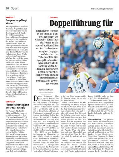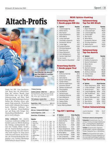Nach sieben Runden in der Fußball-Bundesliga klopft der Cashpoint SCR Altach als Siebter an die obere Tabellenhälfte an. Austria Lustenau rangiert dagegen auf dem letzten Tabellenplatz. Das spiegelt sich natürlich auch im NEUE-Ranking wider, bei dem die Leistungen der Spieler der beiden Vereine anhand statistischer Leistungsdaten bewertet werden.