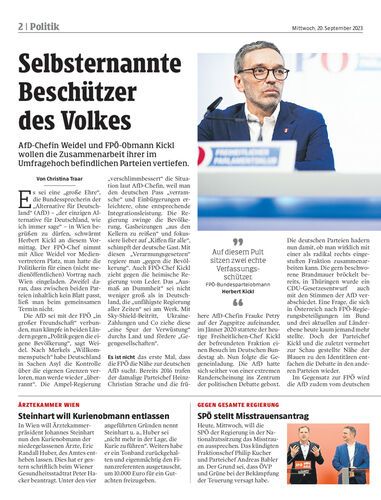 AfD-Chefin Weidel und FPÖ-Obmann Kickl wollen die Zusammenarbeit ihrer im Umfragehoch befindlichen Parteien vertiefen.
