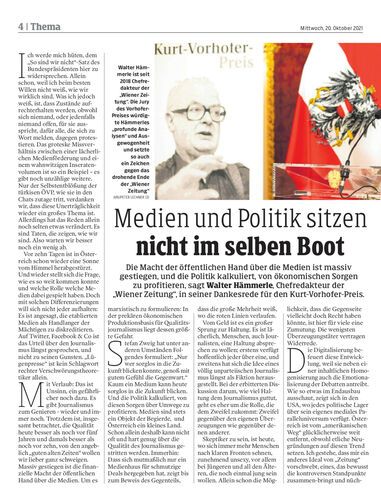 Die Macht der öffentlichen Hand über die Medien ist massiv gestiegen, und die Politik kalkuliert, von ökonomischen Sorgen zu profitieren, sagt Walter Hämmerle, Chefredakteur der „Wiener Zeitung“, in seiner Dankesrede für den Kurt-Vorhofer-Preis.
