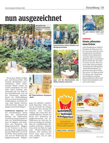 Jagdgenossenschaft Möggers mit Staatspreis „Wald“ ausgezeichnet. Sie spricht sich erneut gegen verpflichtende Schau der Trophäen aus. Ihre Trophäe sei ein guter Lebensraum für Tiere.