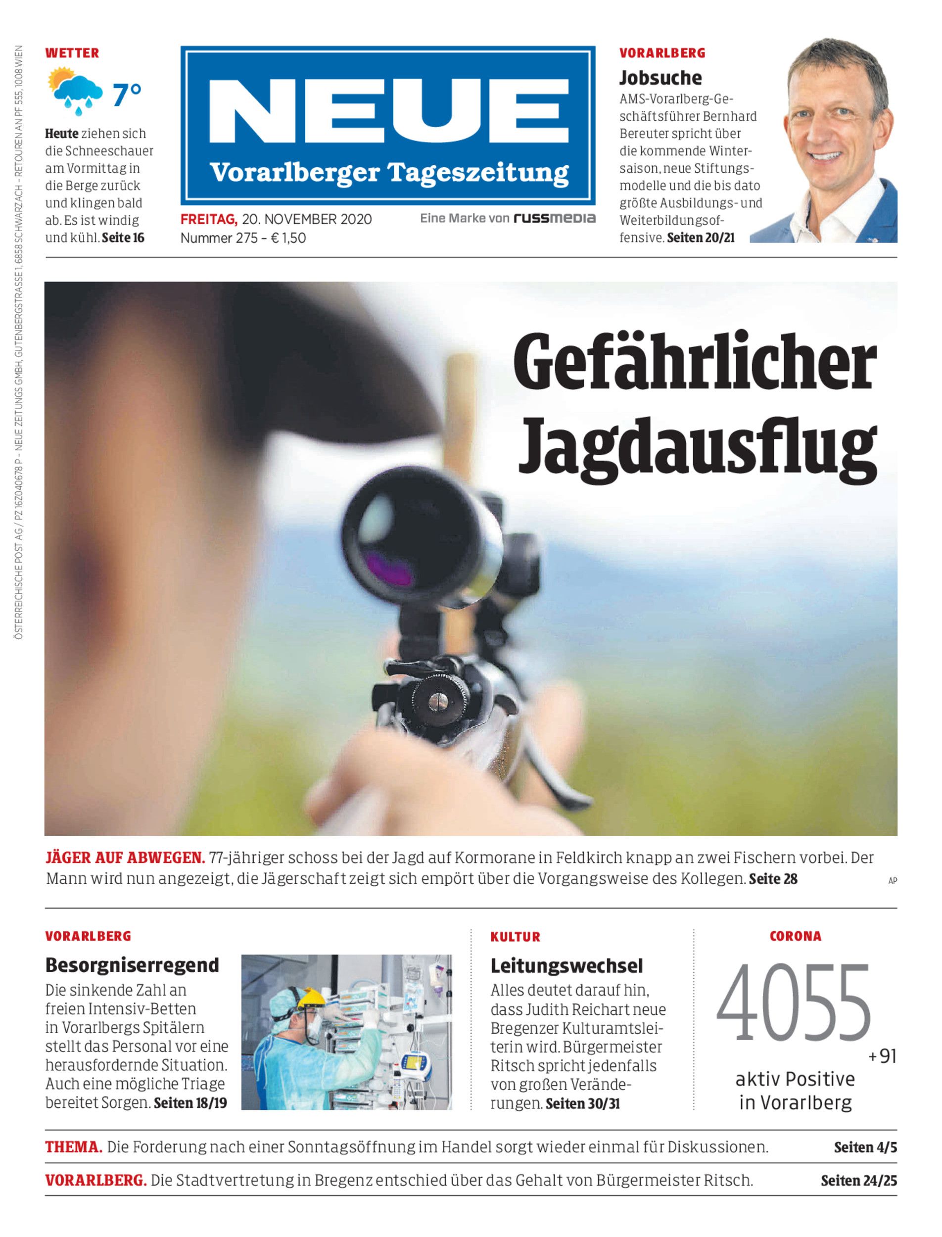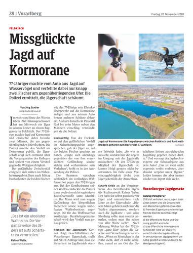 Jäger auf Abwegen. 77-jähriger schoss bei der Jagd auf Kormorane in Feldkirch knapp an zwei Fischern vorbei. Der Mann wird nun angezeigt, die Jägerschaft zeigt sich empört über die Vorgangsweise des Kollegen. Seite 28 AP