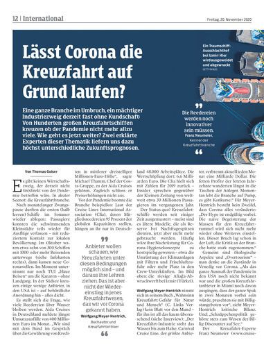 Eine ganze Branche im Umbruch, ein mächtiger Industriezweig derzeit fast ohne Kundschaft: Von Hunderten großen Kreuzfahrtschiffen kreuzen ob der Pandemie nicht mehr allzu viele. Wie geht es jetzt weiter? Zwei erklärte Experten dieser Thematik liefern uns dazu höchst unterschiedliche Zukunftsprognosen.