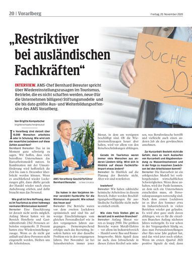 Interview. AMS-Chef Bernhard Bereuter spricht über Wiedereinstellungszusagen im Tourismus, Betriebe, die es nicht schaffen werden, neue (für die Unternehmen billigere) Stiftungsmodelle und die bis dato größte Aus- und Weiterbildungsoffensive des AMS Vorarlberg.