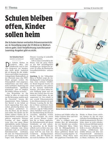 Die Schulen bieten weiterhin Präsenzunterricht an. In Vorarlberg zeigt die VS Bütze in Wolfurt, wie es geht. Eine Verpflichtung zum Distance-Learning-Angebot gibt es nicht.