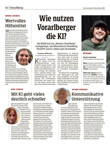 Die NEUE hat vor „Ahead x Vorarlberg“ nachgefragt, wie Menschen in Vorarlberg ChatGPT und Co. sehen und verwenden.
