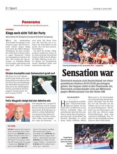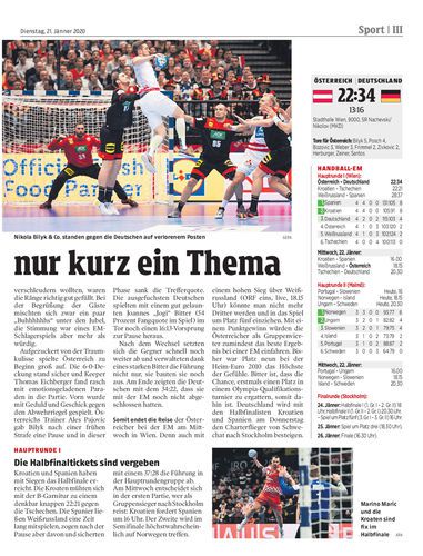 Österreich musste sich Deutschland vor einer grandiosen Kulisse 22:34 (13:16) geschlagen geben. Der Gegner zieht in die Finalrunde ein, Österreich verabschiedet sich am Mittwoch gegen Weißrussland von der Heim-EM.