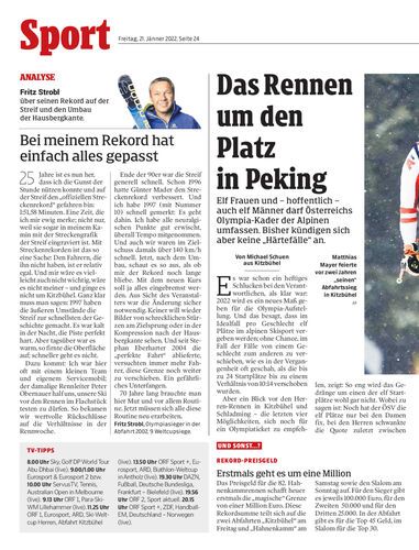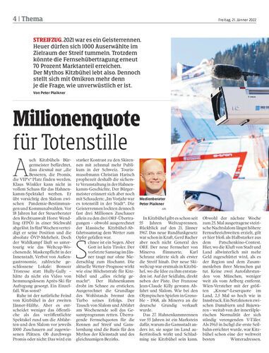 STREIFZUG. 2021 war es ein Geisterrennen. Heuer dürfen sich 1000 Auserwählte im Zielraum der Streif tummeln. Trotzdem könnte die Fernsehübertragung erneut 70 Prozent Marktanteil erreichen. Der Mythos Kitzbühel lebt also. Dennoch stellt sich mit Omikron mehr denn je die Frage, wie unverwüstlich er ist. Von Peter Plaikner