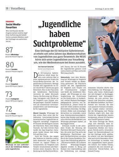 Eine Umfrage der EU-Initiative Saferinternet.at erhebt seit zehn Jahren das Medienverhalten von Jugendlichen aus ganz Österreich. Die NEUE hörte sich unter Jugendlichen aus Vorarlberg um, wie der Medienkonsum bei ihnen aussieht.