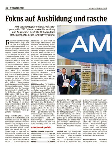 AMS Vorarlberg präsentiert Arbeitsprogramm für 2026. Schwerpunkte: Vermittlung und Ausbildung. Rund 39,2 Millionen Euro stehen dem AMS dieses Jahr zur Verfügung.