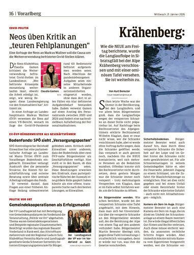 Wie die NEUE am Freitag berichtete, wurde die Langlaufloipe in Sibratsgfäll bei der Alpe Krähenberg verschlossen und mit einer ominösen Tafel versehen. Sie ist weiterhin zu.