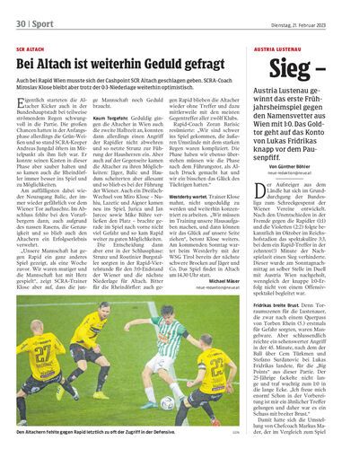 Austria Lustenau gewinnt das erste Frühjahrsheimspiel gegen den Namensvetter aus Wien mit 1:0. Das Goldtor geht auf das Konto von Lukas Fridrikas knapp vor dem Pausenpfiff.