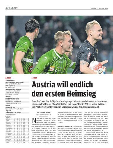 Zum Auftakt des Frühjahrsdurchgangs misst Austria Lustenau heute vor eigenem Publikum (Anpfiff 18 Uhr) mit dem SKN St. Pölten seine Kräfte. Die Partie von SW Bregenz in Voitsberg wurde hingegen abgesagt.