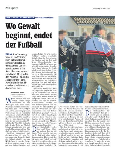 Essay. Am Samstag kam es im VFV-Cup zum Ortsduell zwischen FC Lustenau und Austria Lustenau Amateure. Im Anschluss zettelten rund zehn Mitglieder des Austria-Fanklubs „Nordtribüne“ eine Rauferei mit den Sicherheitskräften an. Gedanken dazu.