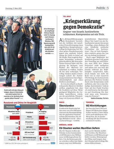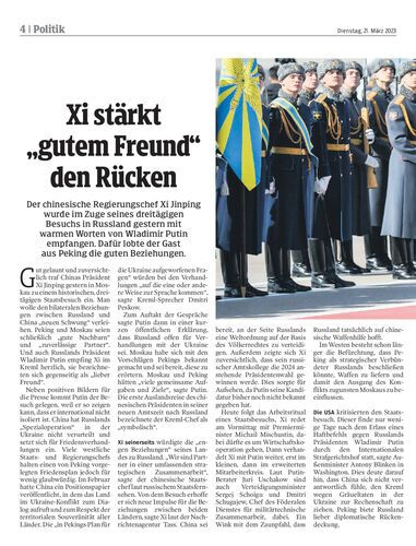 Der chinesische Regierungschef Xi Jinping wurde im Zuge seines dreitägigen Besuchs in Russland gestern mit warmen Worten von Wladimir Putin empfangen. Dafür lobte der Gast aus Peking die guten Beziehungen.