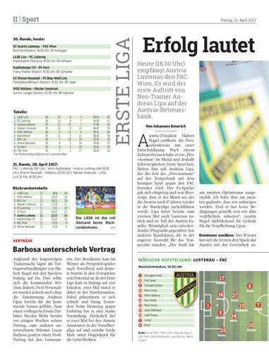 Heute (18.30 Uhr) empfängt Austria Lustenau den FAC Wien. Es wird der erste Auftritt von Neo-Trainer Andreas Lipa auf der Austria-Betreuerbank.