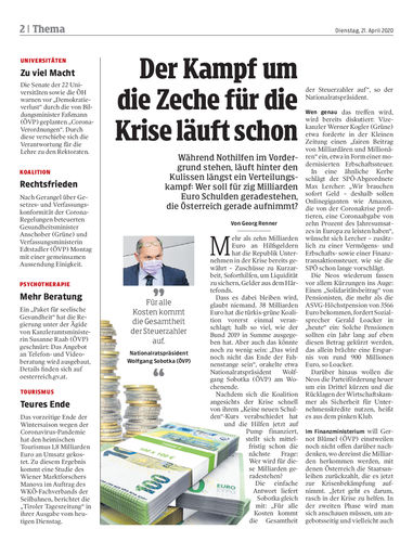 Kampf um Zeche. Mehr als zehn Milliarden Euro an Hilfsgeldern hat die Republik Unternehmen in der Krise bereits gewährt. Doch wer soll für die zig Milliarden Euro Schulden geradestehen, die Österreich gerade aufnimmt? Seiten 2/3 APA