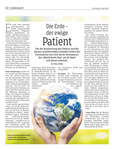 Für die Ausbeutung des Globus und die daraus resultierenden Schäden liefert die Coronakrise nur eine kurze Atempause. Der „World Earth Day“ am 22. April soll daran erinnern. Von Klaus Höfler